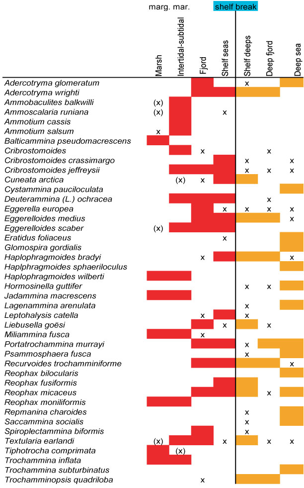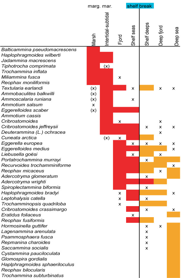 Figure 7. Distribution of ATA taxa by environment, 1. Species arranged alphabetically by genus, 2. Species in order of occurrence. Red and orange = >10%; x = <10%. (x) indicates tests interpreted to be transported.