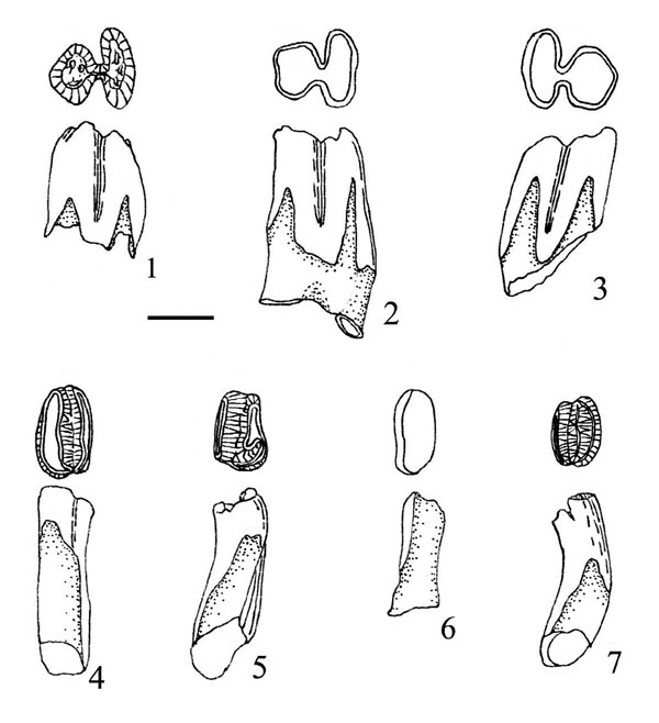 FIGURE 10. Lower cheek teeth of Pliogeomys parvus from the Panaca local fauna. 10.1-10.3, occlusal and labial views of p4s, UALP 23264, 23263, 21579. 10.4, a left m1, UALP 23256. 10.5, a right m2, UALP 23257. 10.6, a right m1 or m2, UALP 21574. 10.7, a right m3, UALP 23172. The scale bar is 1 mm.
