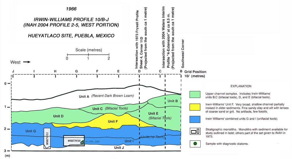 FIGURE 3. Irwin-Williams profile 10/B-J, with Irwin-Williams' unit designations,1966, Hueyatlaco Site (adapted from Irwin-Williams' original by VSM to include VanLandingham (2006) diatom localities 1973 stratigraphic monolith positions, and 1973 and 2004 trench wall intersections.