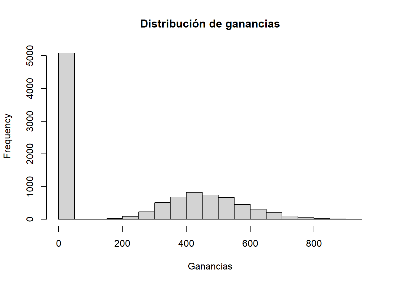 hist(resultados, breaks = 20, main = "Distribución de ganancias", xlab = "Ganancias")
