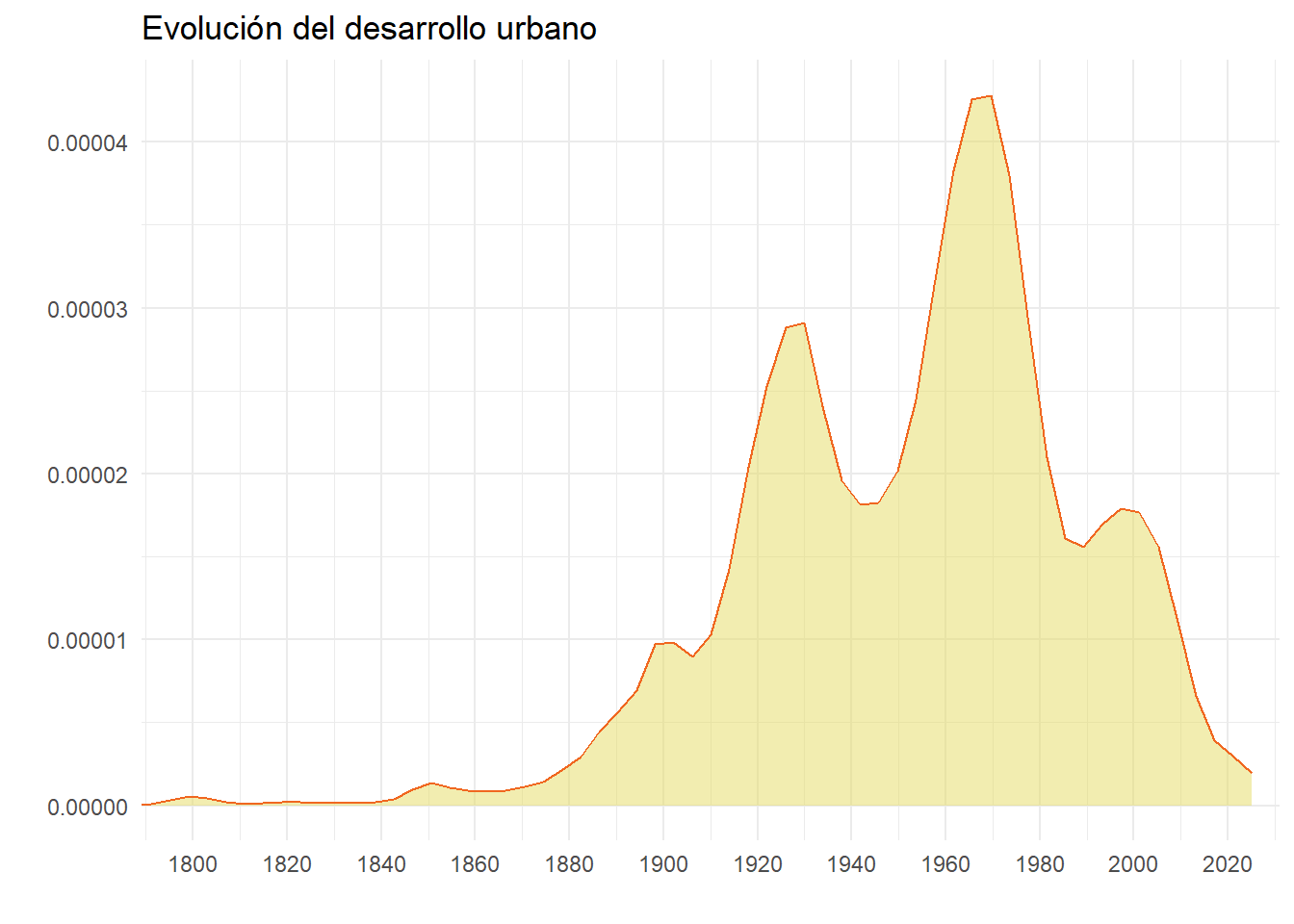 Antes de crear el mapa de la edad del edificado, lo que reflejará el crecimiento urbano, haremos un gráfico de distribución de la fecha de construcción de los edificios. De este modo, podremos identificar fácilmente los períodos de expansión urbana. Usaremos el paquete ggplot2(Wickham et al., 2022) con la geometría de geom_density() para este objetivo.
