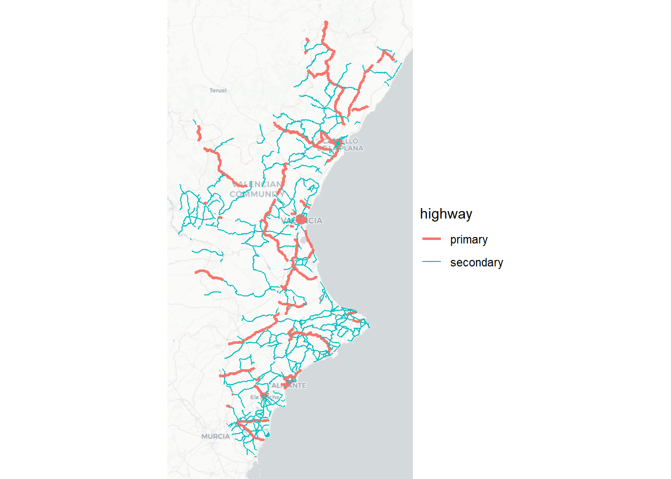 unique(pbf_path$highway) [1] "primary" "pedestrian" "secondary"