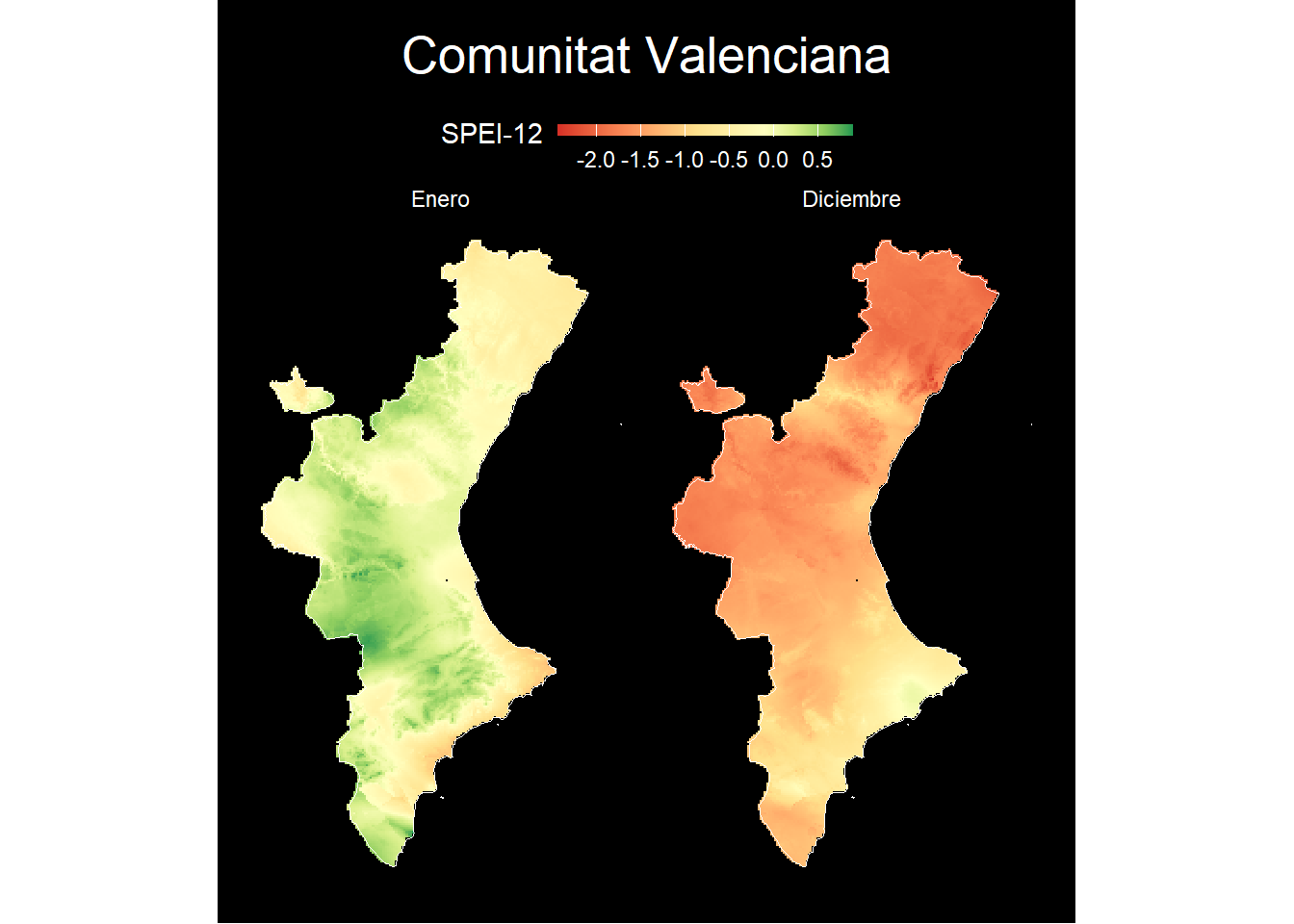 En este último ejemplo seleccionamos la situación de sequía a 12 meses vista, es decir, al principio y al final del año. La función principal es crop(), que recorta a la extensión de un objeto espacial (en nuestro caso la Comunitat Valenciana). Después aplicamos la función mask(), que enmascara todos aquellos píxeles dentro de los límites dejando en NA los demás.