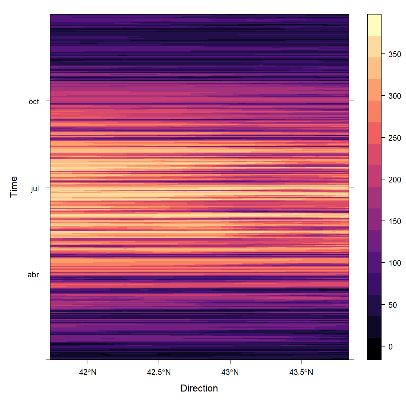 La función horizonplot() crea gráficos de horizonte, con muchas series temporales en paralelo, cortando el rango vertical en segmentos y superponiéndolos con colores que representan la magnitud y la dirección de la desviación. Cada serie temporal corresponde a una zona geográfica definida con dirXY y promediada con zonal.