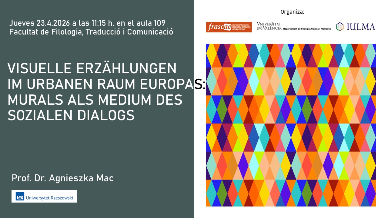 VISUELLE ERZÄHLUNGEN IM URBANEN RAUM EUROPAS: MURALS ALS MEDIUM DES SOZIALEN DIALOGS VISUELLE ERZÄHLUNGEN IM URBANEN RAUM EUROPAS: MURALS ALS MEDIUM DES SOZIALEN DIALOGS 17/04/26 Conferencia: VISUELLE ERZÄHLUNGEN IM URBANEN RAUM EUROPAS: MURALS ALS MEDIUM DES SOZIALEN DIALOGS La profesora Prof. Dr. Agnieszka Mac de la Uniwersytet Rzeszowski, dará una charla titulada...[Read more]