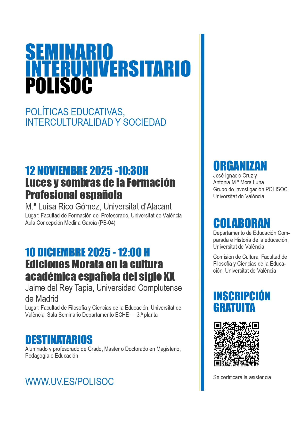Attendance at the seminars “Lights and Shadows of Spanish Vocational Education and Training” and “Ediciones Morata in the Spanish Academic Culture of the Twentieth Century” will be certified for students enrolled in the Doctoral Programme in Education at the University of Valencia.