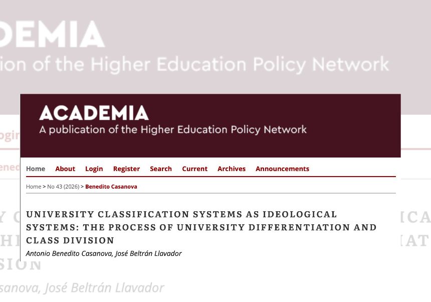 Nuestro compañero Toni Benedito acaba de publicar junto con Pepe Beltrán el artículo "University classification systems as ideological systems: the process of university differentiation and class division" en la revista Academia. El artículo forma parte de un monográfico titulado Special issue on...