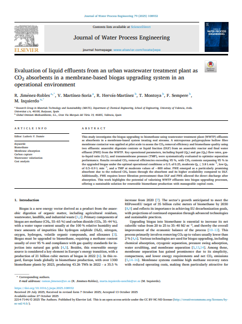 R. Jiménez-Robles, M. Izquierdo, V. Martínez-Soria, R. Hervás-Martínez, T. Montoya, F. Sempere. Membrane contactor performance for the dissolved methane recovery from the liquid effluent of a desulphurisation reactor for biogas purification: Evaluation of operating conditions, fouling and cleaning strategies. Journal of Water Process Engineering, 71,2025, 107210