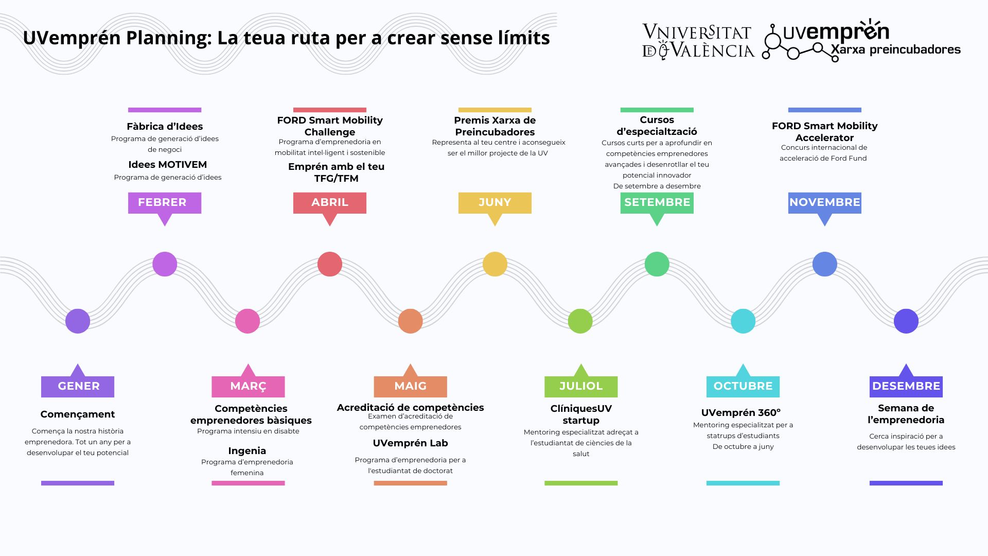 L'oferta formativa s'estructura en tres nivells —Primers passos per a emprendre, Competències emprenedores bàsiques i Especialització en emprenedoria— i està dirigida a estudiants de grau, màster o doctorat interessats a adquirir habilitats clau per a l'emprenedoria. A més, els qui completen esta formació podran optar a un examen que els permetrà obtindre el certificat de competències transversals emprenedores innovadores de la UV, enriquint així el seu perfil acadèmic i professional.