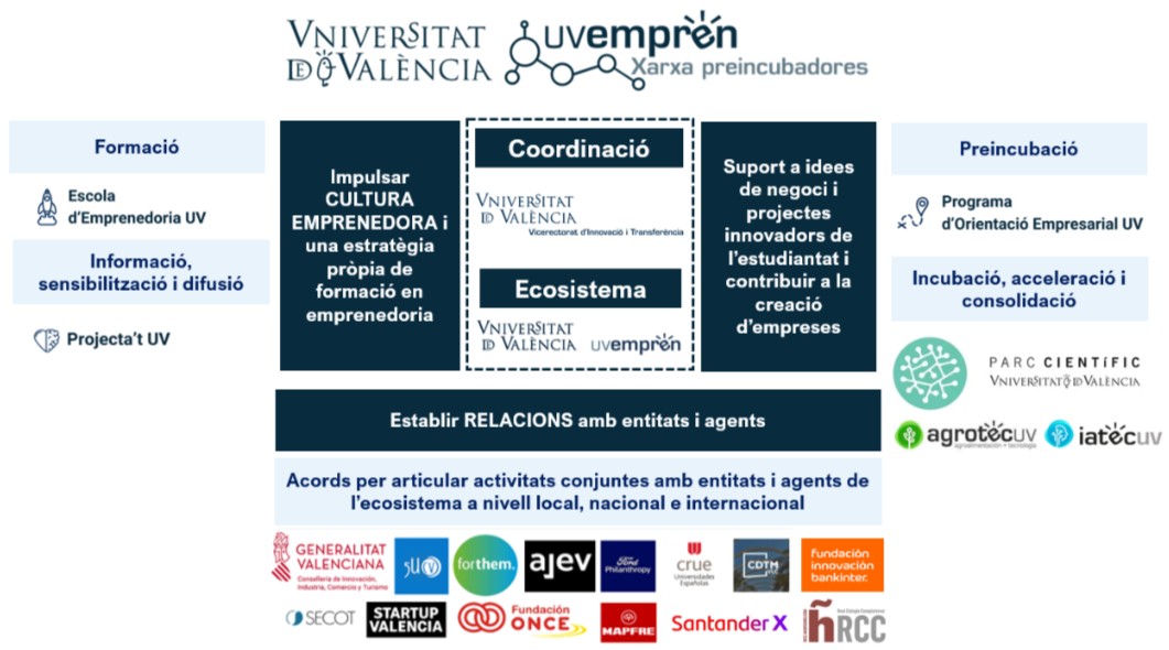 La Xarxa de preincubadores d'Emprenedoria de la Universitat de València impulsa la cultura emprenedora i una estratègia pròpia de formació en emprenedoria per a capacitar a l'estudiantat, de qualsevol àrea de coneixement de la UV, en la generació i validació de projectes emprenedors. Sota la coordinació del vicerectorat amb competències delegades en emprenedoria, esta xarxa compta amb la col·laboració d'una sèrie d'entitats i empreses que conformen un ecosistema propi de suport a l'estudiantat emprenedor per a, des de l'àmbit que ens correspon, contribuir a generar un nou model socioeconòmic en el territori, més intensiu en coneixement i generador d'ocupabilitat i de productivitat projecte.