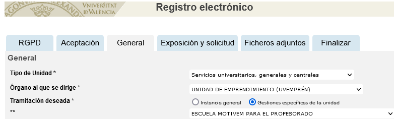 - Tramitación deseada: Gestiones específicas de la unidad. ESCUELA MOTIVEM PERA EL PROFESORADO.