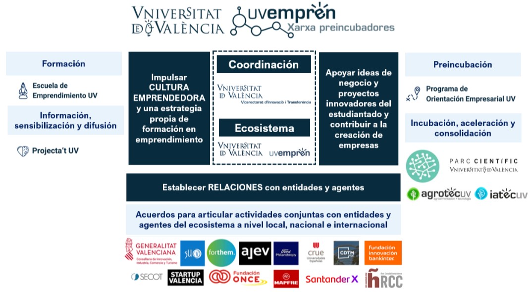 La Red de Preincubadoras de Emprendimiento de la Universitat de València impulsa la cultura emprendedora y una estrategia propia de formación en emprendimiento para capacitar al estudiantado, de cualquier área de conocimiento de la UV, en la generación y validación de proyectos emprendedores. Bajo la coordinación del vicerrectorado con competencias delegadas en emprendimiento, esta red cuenta con la colaboración de una serie de entidades y empresas que conforman un ecosistema propio de apoyo al estudiantado emprendedor para, desde el ámbito que nos corresponde, contribuir a generar un nuevo modelo socioeconómico en el territorio, más intensivo en conocimiento y generador de empleabilidad y de productividad proyecto.