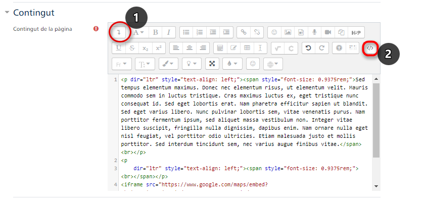 It is required that the page has a name and a brief description of what the page is about. Then, in the "Content" section, write what the page is about. Google Maps can be added using the HTML code provided by the Virtual Classroom editor. In the same "Content" section, first access the text editor button "Show/hide advanced buttons" (1) and then "HTML" (2). If a link is copied and pasted without first activating the HTML in the editor, the page will only display a web link. It is also important to check that the HTML link has been copied from the source page. If HTML is not used in the editor and the HTML link is not copied from the source page, these steps will not work and the page will not preview what should be added to the page.