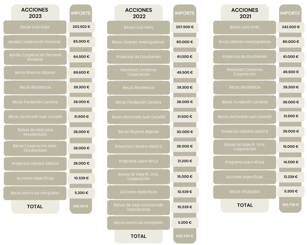 La Universitat de València ha aportado en estos últimos años a la Ayuda Oficial para el Desarrollo. Cabe destacar que la aportación realizada en el año 2020, se vio minorizada por la propagación de pandemia COVID 19.