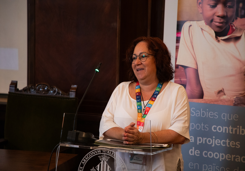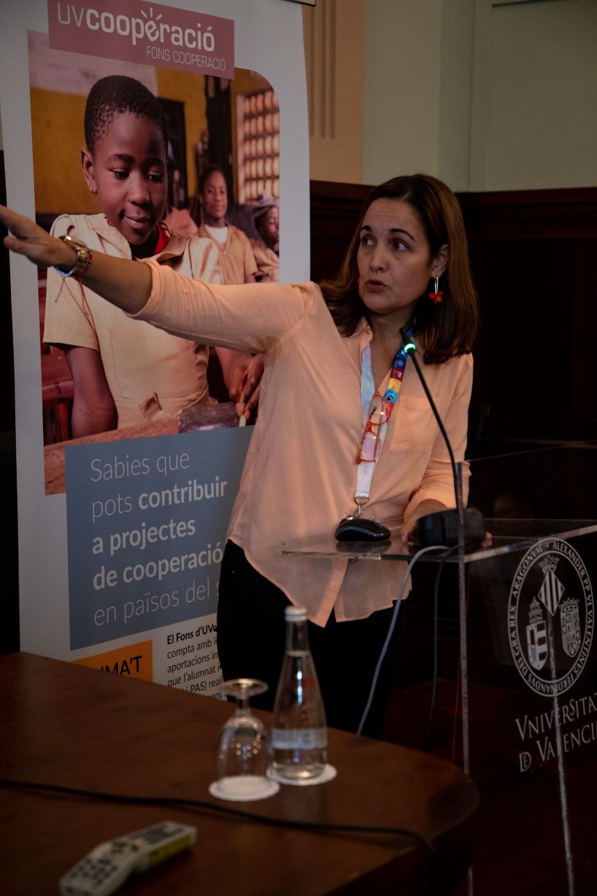 Afterwards, the Rector's Delegate for Development Cooperation, Carmen Lloret Català, presented the Fons UV Cooperació, which finances, with the individual contributions of university students and staff, the development projects carried out by the University of Valencia for the achievement of the 17 Sustainable Development Goals, with the aim of helping the comprehensive development of people in southern countries.