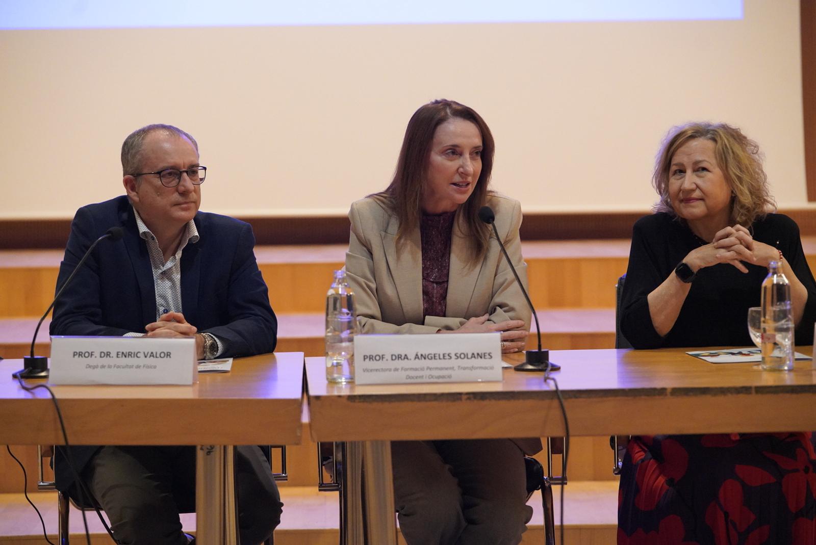 La vicerrectora Ángeles Solanes ha remarcado la «buena colaboración» de los dos centros de la Universitat de València (Facultad de Farmacia y Ciencias de la Alimentación y Facultad de Física) que participan en este foro conjunto. Dirigiéndose al estudiantado, les ha recordado que el compromiso de la Universitat de València siempre es apostar por la mejor formación académica y, además, continuar acompañándoles en su empleabilidad a través de jornadas como los foros de empleo.