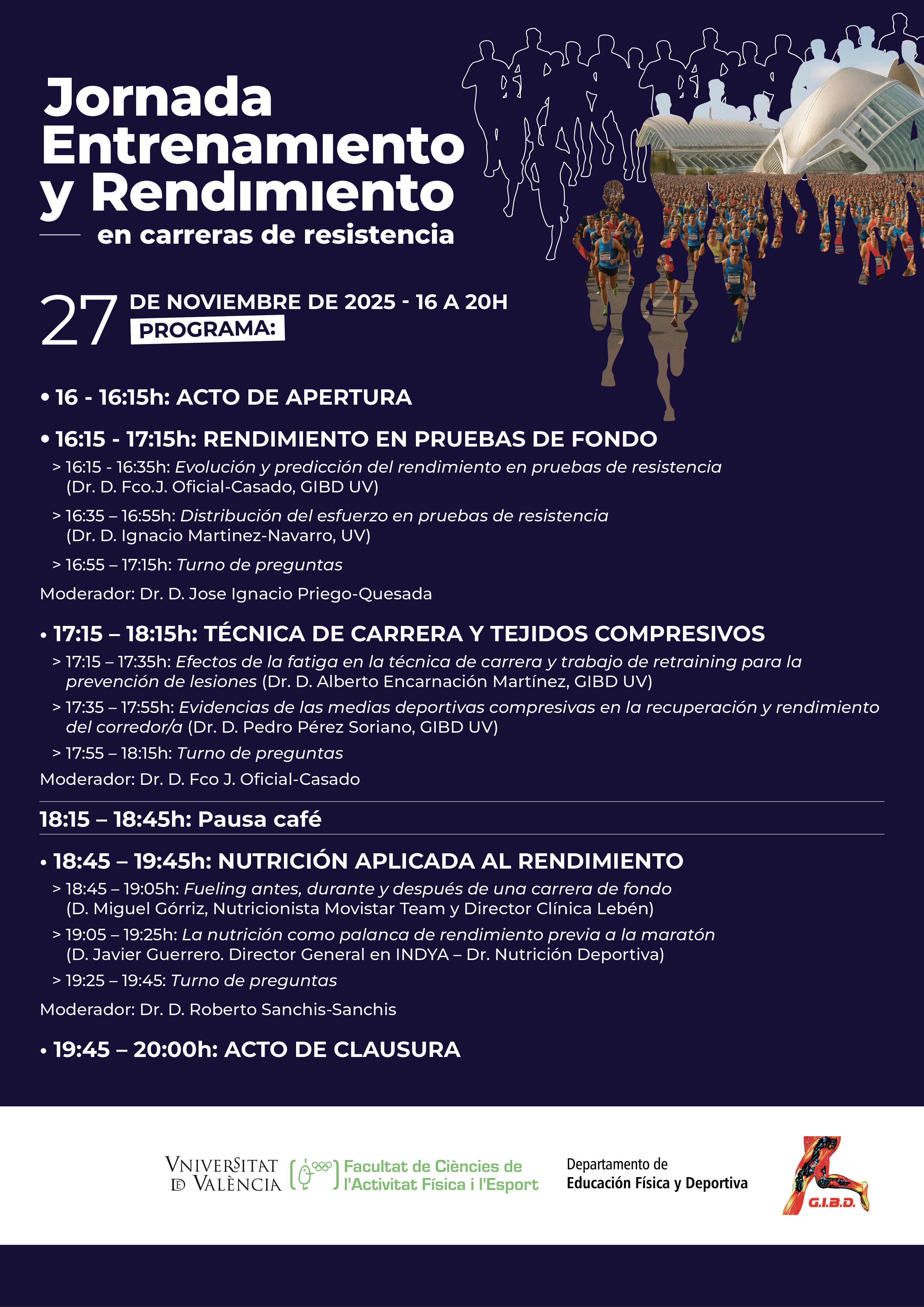 El próximo 27 de noviembre de 2025, la Universitat de València celebrará las IX Jornadas del Grupo de Investigación en Biomecánica Deportiva (GIBD), centradas en esta ocasión en el entrenamiento y rendimiento en carreres de resistencia. La reunión tendra lugar de 16:00 a 20:00 horas en el Saló de Graus de la Facultat de Ciències de l'Activitat Física i l'Esport (FCAFE-UV).