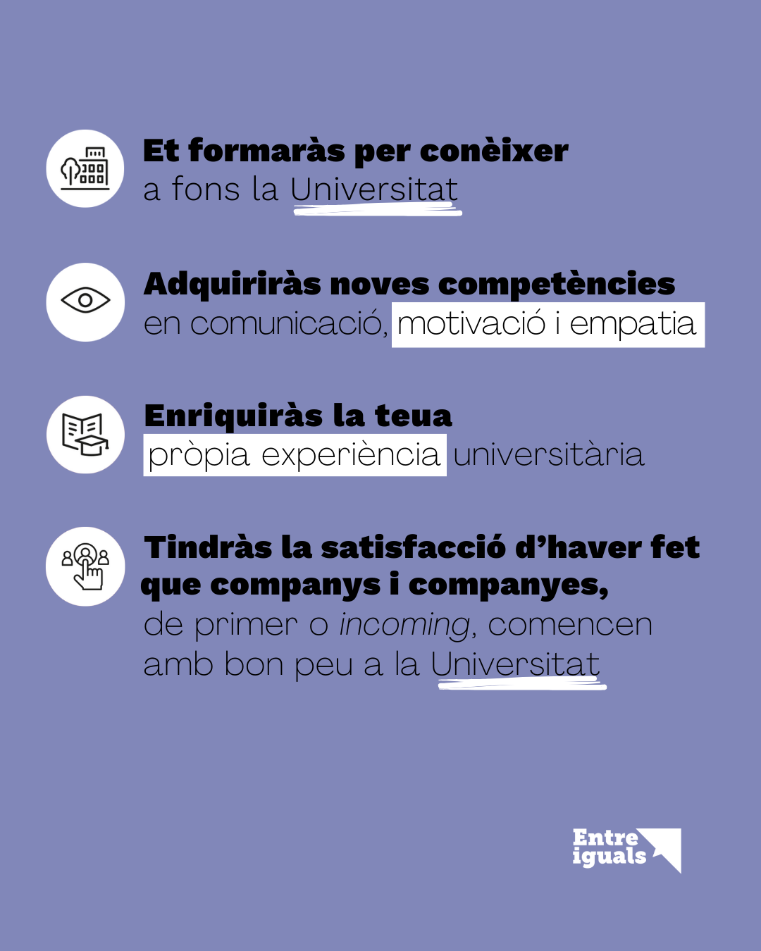 - Tenir la satisfacció d’haver fet que nous companys i companyes comencen amb bon peu a la Universitat.