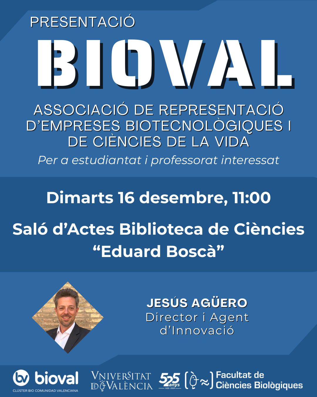 En el context de reforçar les relacions entre el grau en Biotecnologia i les empreses biotecnològiques del nostre territori, el proper 16 de desembre a les 11:00 en el Saló d'Actes de la Biblioteca ‘Eduard Boscà’, Jesús Agüero, el gerent de BioVal (Associació que representa empreses i entitats de l'àmbit de la biotecnologia i les ciències de la vida) ens farà una presentació d'aquesta associació.