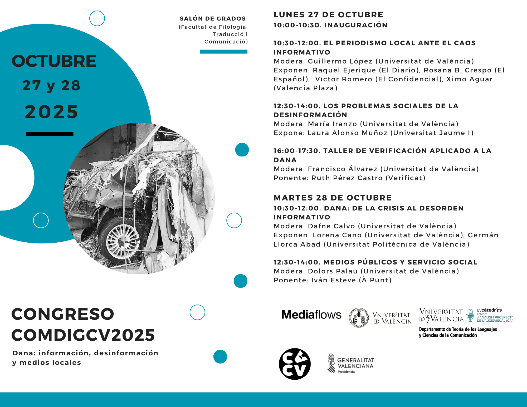 El segundo día estará dedicado al análisis académico y al papel de los medios públicos. En la mesa “DANA: de la crisis al desorden informativo”, intervendrán Lorena Cano (Universitat de València) y Germán Llorca Abad (Universitat Politècnica de València). El congreso concluirá con la ponencia de Iván Esteve (À Punt), titulada “Medios públicos y servicio social”.