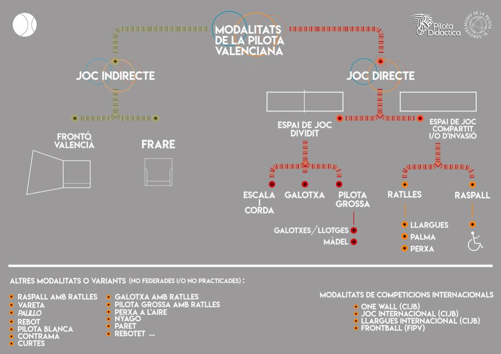 El principal motiu de la riquesa cultural de la pilota valenciana, són l’existència de diverses modalitats, que es practiquen al llarg del territori valencià. Aquestes, les podem classificar de diverses maneres: segons la instal·lació, segons el tipus de pilota… Per a realitzar la següent classificació hem tingut en compte classificacions ja existents dels diferents tipus de jocs d’autors com: Ellis (1983), Almond (1986), Devís (1993) i Méndez (2003), així com les diferents classificacions de modalitats de pilota ja existents d’autors com: F. Llopis-Bausset (1984), Víctor Iñúrria (1995) i Manolo Conca i altres (2003 i 2018).