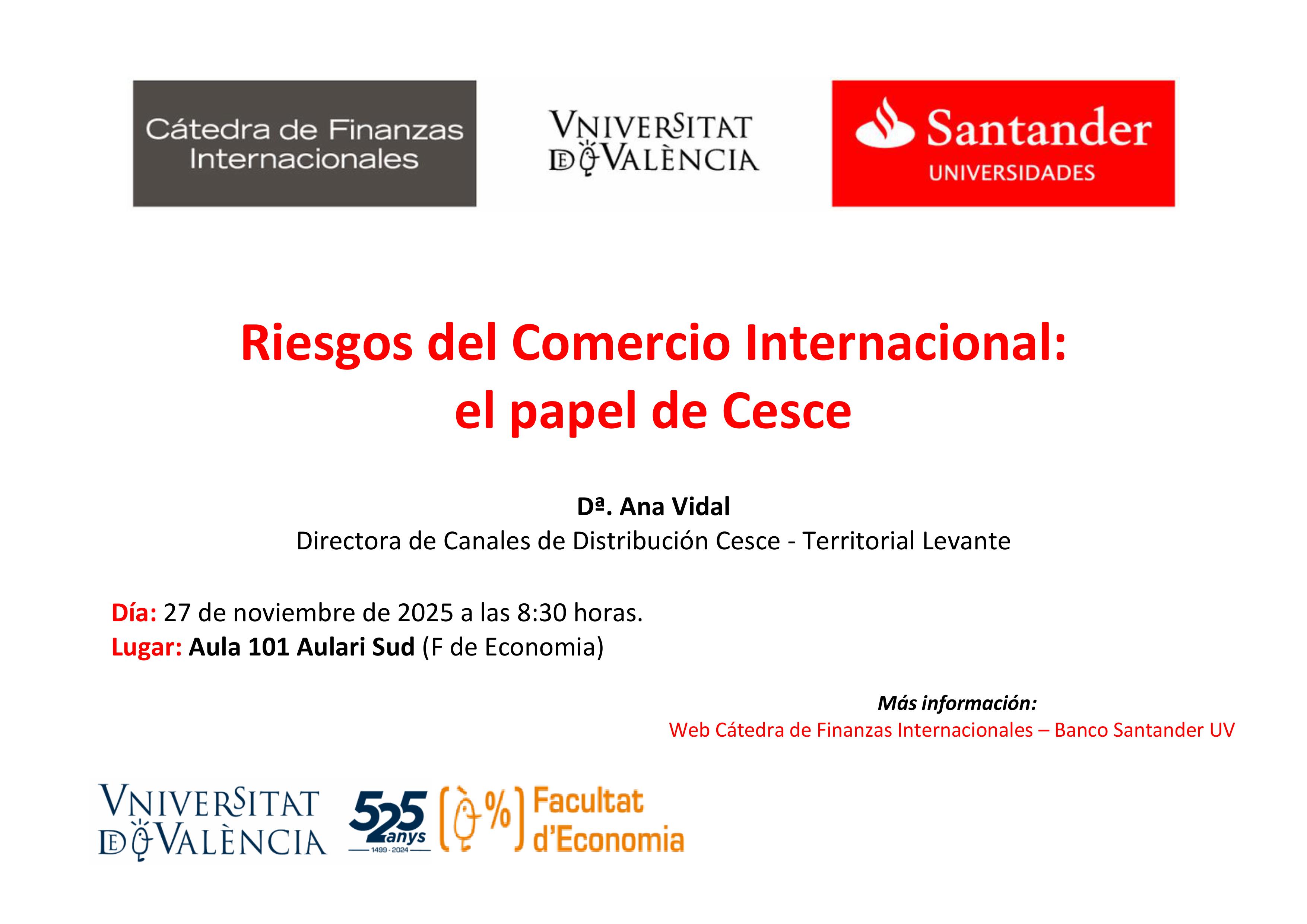 La Càtedra de Finances Internacionals- Banc Santander Universitat de València organitza el seminari "Riscos del Comerç Internacional: el paper de Cesce", una sessió en la qual s'abordaran els principals riscos als quals s'enfronten les empreses quan operen en mercats internacionals i el paper que exerceix Cesce en la seua gestió i cobertura.