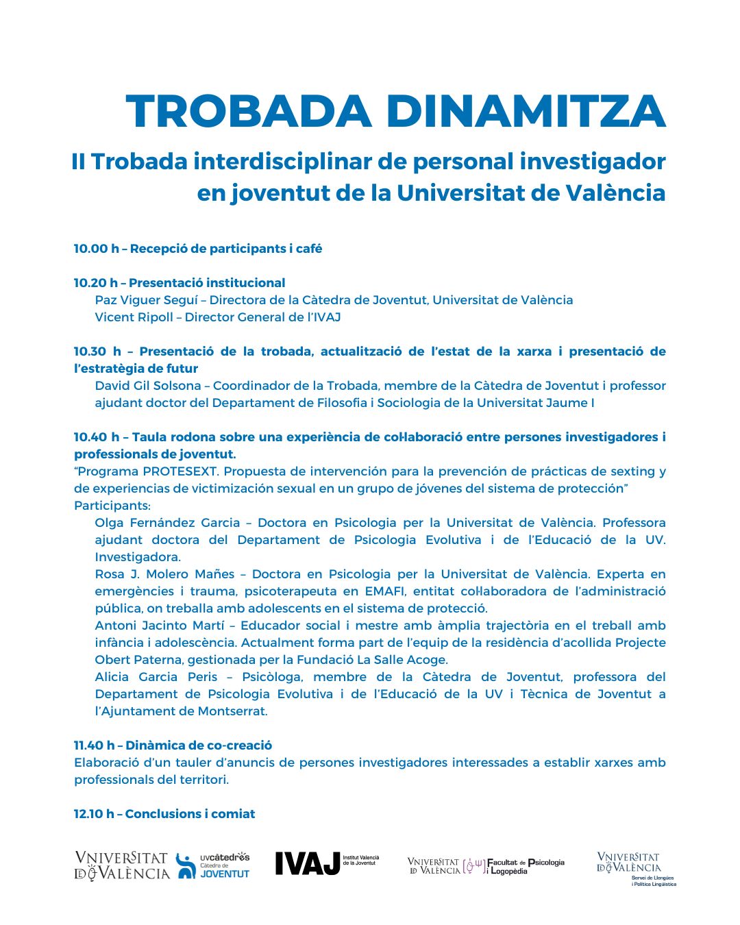El passat 7 d’octubre es va celebrar la segona edició de la Trobada DINAMITZA, una iniciativa impulsada per la Càtedra de Joventut de la Universitat de València amb l’objectiu de connectar personal investigador de diverses facultats de la UV que treballa amb adolescents i joves com a eix central de la seua recerca.