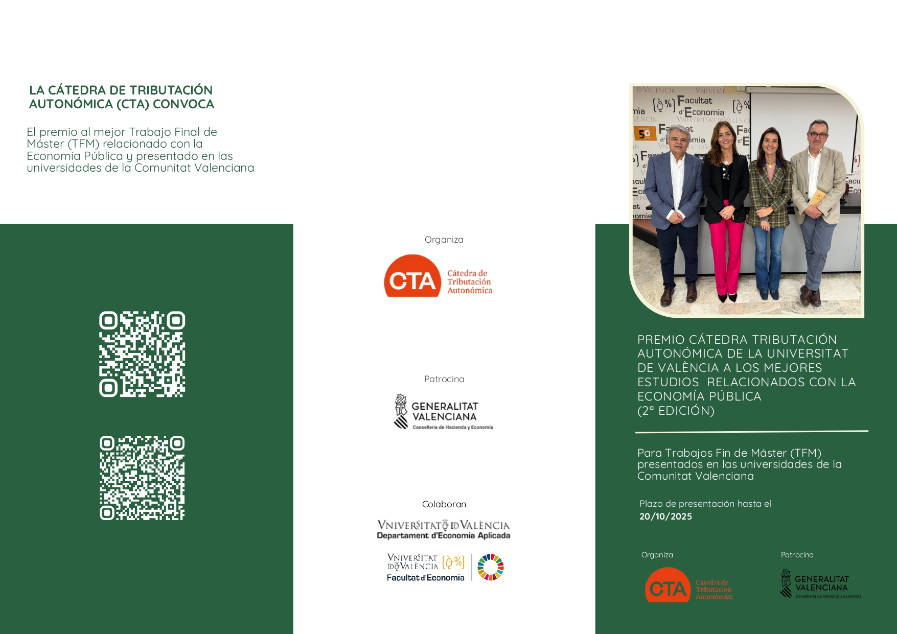 La Càtedra de Tributació Autonòmica (CTA) de la Universitat de València ha obert la convocatòria de la segona edició del Premi CTA als millors Treballs fi de màster (TFM) en Economia Pública, dirigits a estudiants de les universitats de la Comunitat Valenciana