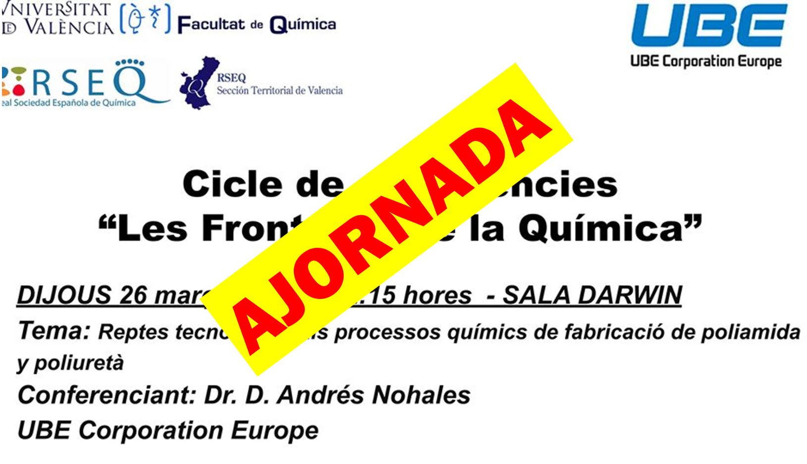 Les Fronteres de la Química. Cicle de seminaris organitzat per la Secció Territorial de València RSEQ i la Facultat de Química de la Universitat de València. Data: dijous 26 de març de 2020. Lloc: Sala Darwin (Aulari Interfacultatiu) Hora: 12:15h. Conferenciant: Dr. Andrés Nohales, R&D Chemical Materials Dev. Manager, UBE Corporation Europe, S.A.