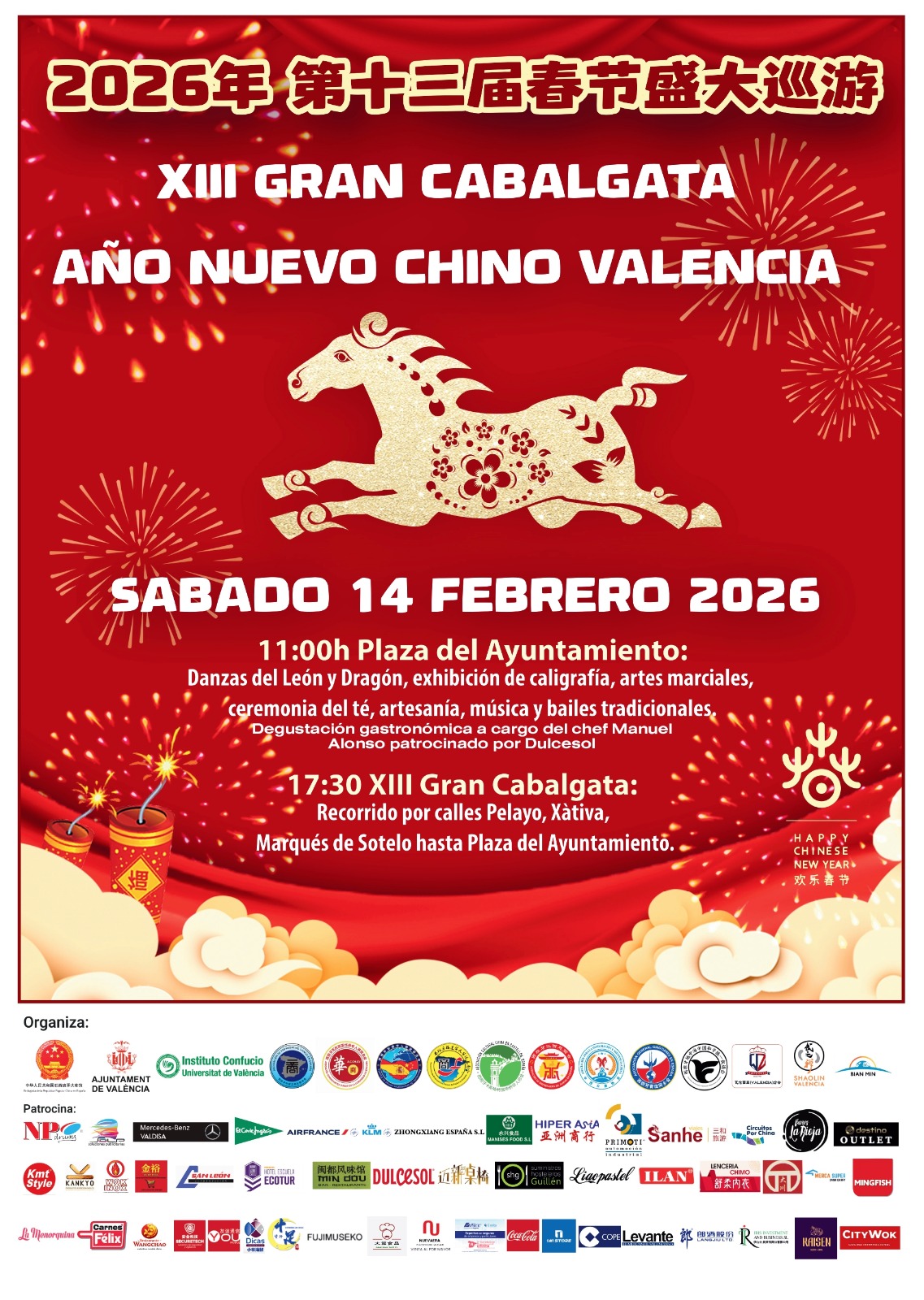 El dissabte 14 de febrer celebrarem la XIII Gran Cavalcada de l'Any Nou Xinés del Cavall de Foc, el 4724 segons el còmput tradicional. Des de les 11 de demà, es podrà gaudir en la Plaça de l'Ajuntament de les danses del lleó i el drac, exhibicions de cal·ligrafia i arts marcials, entre altres demostracions culturals. I, a partir de les 17.30, començarà la Gran Cavalcada, que partirà del carrer Pelayo i passarà per Xàtiva i Marqués de Sotelo fins a tancar el recorregut en la citada plaça. Des que l'Institut Confuci de la Universitat de València promoguera aquesta iniciativa en 2012, milers de persones acudeixen cada any a festejar l'Any Nou Xinés en els cèntrics carrers de València.