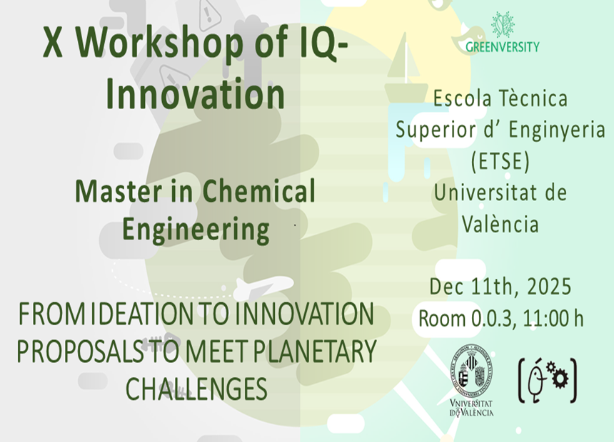 El Màster en Enginyeria Química de la Universitat de València organitza la X Jornada de IQ-Innovació en Enginyeria Química, en la qual l@s estudiants proposen una innovació tecnològica com a solució a una necessitat o com a oportunitat en una veta de mercat concreta.