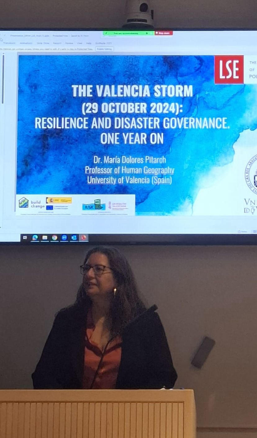 Durant la seua intervenció, María Dolores Pitarch va presentar la ponència “The València Storm (29 October 2024): Resilience and Disaster Governance One Year On”, en la qual va analitzar la situació viscuda a València després de la tempesta ocorreguda fa poc més d'un any. En la seua exposició va destacar els principals factors per a enfortir la resiliència i la governança davant esta mena de catàstrofes, subratllant la importància que els processos de recuperació incloguen mesures de millora que permeten previndre i reduir els riscos futurs.
