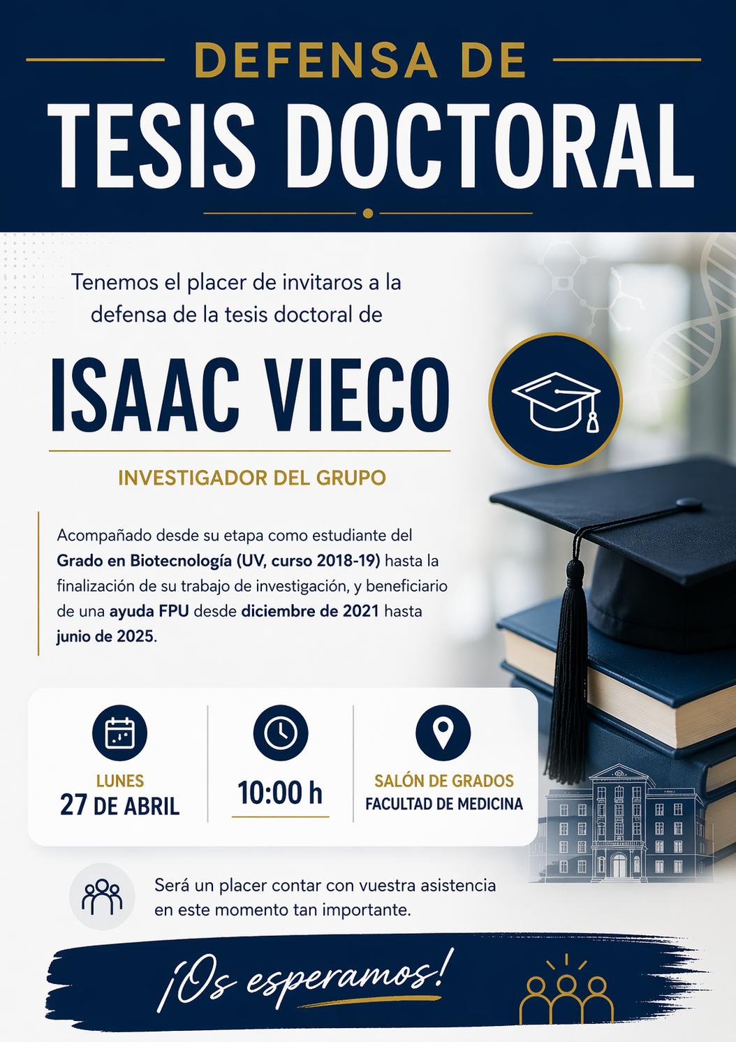 El próximo día 27/04/2026 a las 10:00, Isaac Vieco Martí del depto. de Patología defenderá su tesis: "Neuroblastoma: mechanotherapeutic strategies based on 3D models with vitronectin rich microenviroment." Tendrá lugar en el Salón de Grados de la Facultad de Medicina