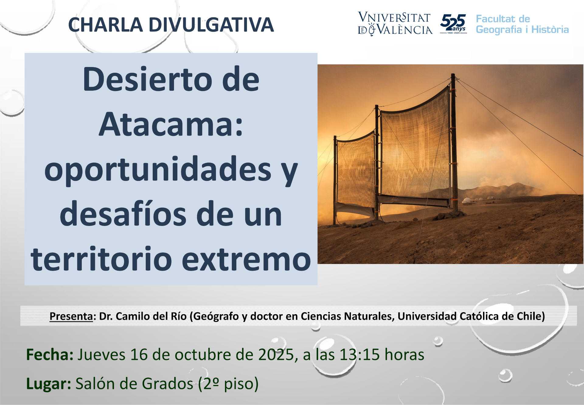El próximo jueves día 16 viene a visitarnos a la facultad el investigador chileno Dr. Camilo del Río, profesor de la Universidad Católica de Chile, quien dará la charla titulada "Desierto de Atacama: oportunidades y desafíos de un territorio extremo".