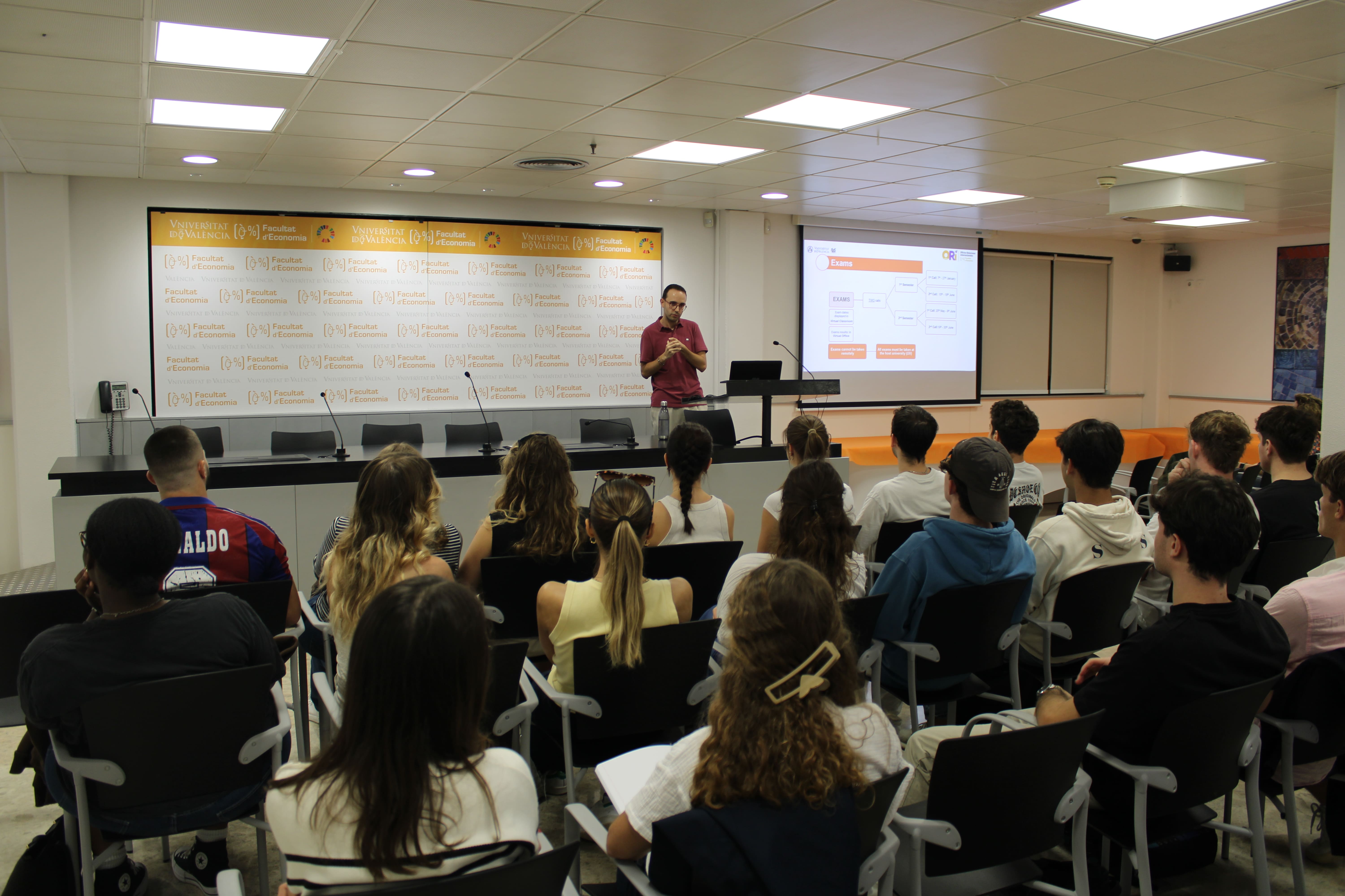 Durante la sesión, el equipo de coordinación explicó a los estudiantes los principales aspectos del programa curricular, las prácticas en empresa y el Trabajo de Fin de Grado, que deberán realizar a lo largo de sus dos años de estancia en la Universitat de València.