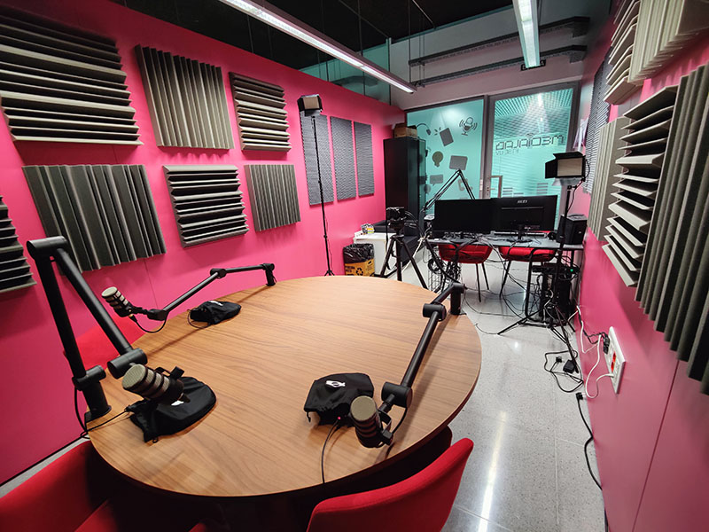 Audio recording laboratory with soundproofing, computer, mixing desk, microphones and lighting for recording and broadcasting.