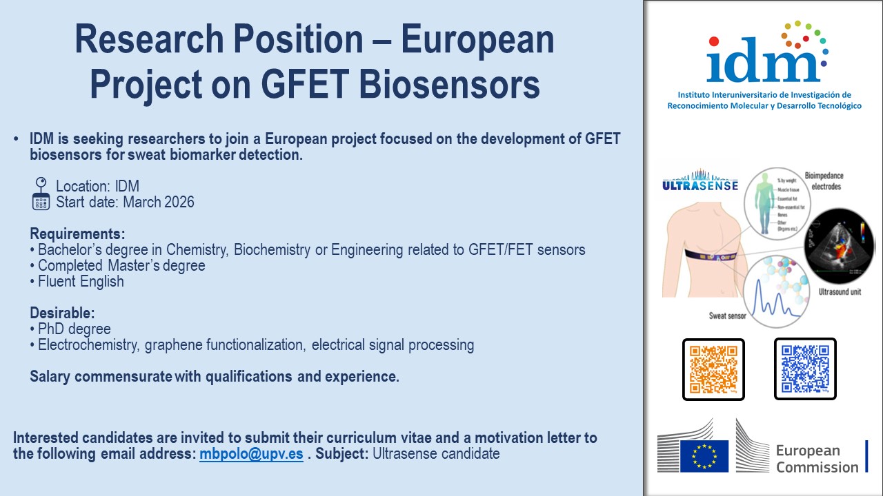 El IDM busca investigadores/as para un proyecto europeo centrado en el desarrollo de biosensores GFET destinados a la detección de biomarcadores en sudor. Se requiere formación en Química, Bioquímica o Ingenierías afines, máster finalizado y buen nivel de inglés, valorándose la experiencia en...