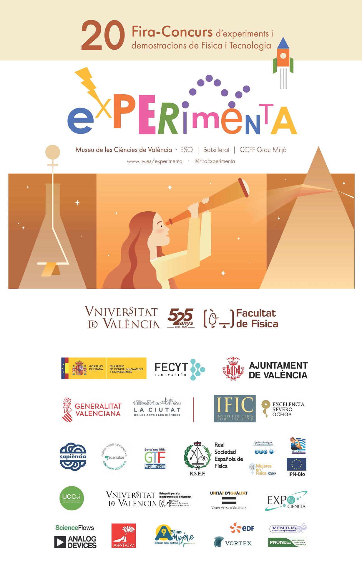 Más de 3500 personas han participado en la 20ª Feria-Concurso Experimenta 2025, organizada por la Facultad de Física de la Universitat de València (UV) y celebrada el domingo en el Museo de las Ciencias de València con 66 proyectos STEM que involucraron a 300 participantes, entre alumnado y profesorado de secundaria. En el acto de entrega de premios –en el auditorio Santiago Grisolía del Museo– la rectora de la UV, Mª Vicenta Mestre, felicitó a los participantes por su interés, entusiasmo y esfuerzo. También se realizó un breve intermedio científico, “teoría de cuerdas... de guitarra”, de Ana Cros y Chantal Ferrer, profesoras de la Facultad de Física de la UV.