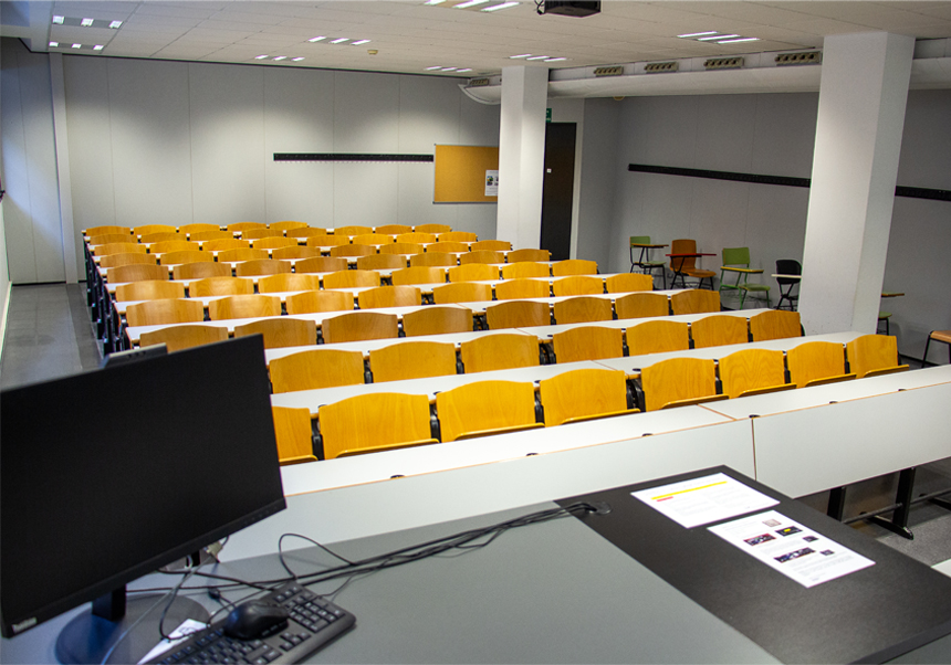 L’aula disposa de 61 places i 2 per a persones amb mobilitat redüida. Mobiliari fix i adaptat. Tarima. Equip informàtic per al professorat amb taula multimèdia que inclou: micròfon, carregador de bateries i sistema audiovisual independent. Sistema d'ensenyament híbrid que inclou càmera en monitor. Canó de projecció amb punter/passador per a presentacions. Enfosquiment per a projecció mitjançant estors. Pissarra de guix. Endolls als llocs de treball. Telèfon de suport amb el personal de consergeria. Megafonia de seguretat. Wifi.