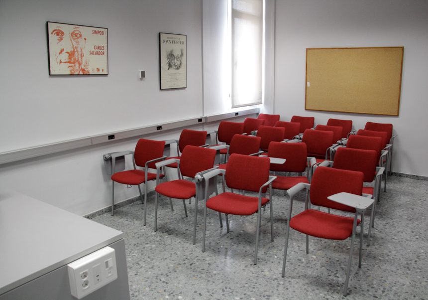 L'aula disposa de 20 places. Mobiliari mòbil i adaptat. Equip informàtic per al professorat amb taula multimèdia que inclou: micròfon i sistema audiovisual independent. Sistema d'ensenyament híbrid que inclou una càmera en sostre. Canó de projecció amb punter/passador per a presentacions. Enfosquiment per a projecció mitjançant estor. Pissarra de guix. Endolls als llocs de treball. Megafonia de seguretat. Wifi.