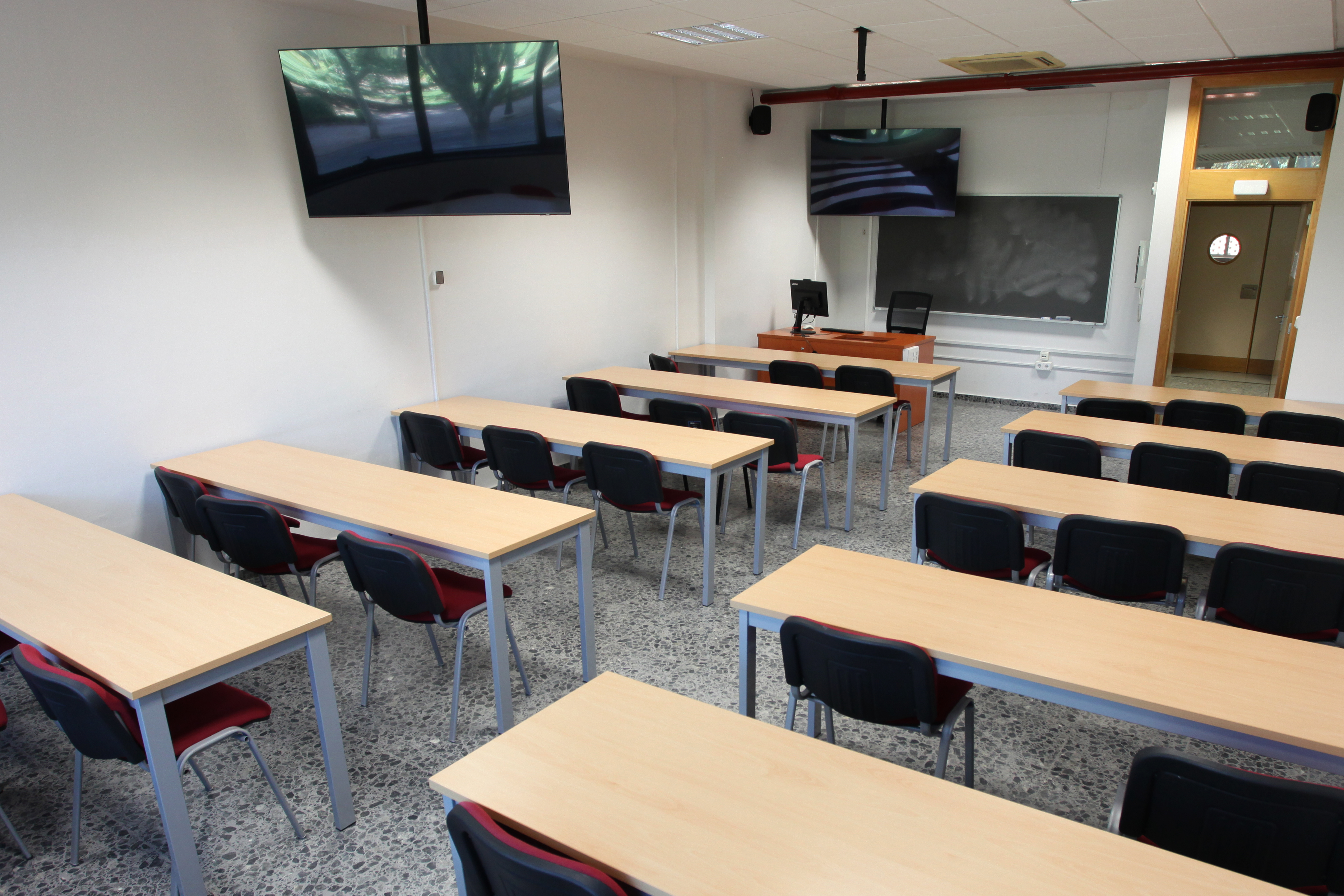 El aula dispone de 48 plazas. Mobiliario móvil y adaptado. Equipo informático para el profesorado con mesa multimedia que incluye: micrófono y sistema audiovisual independiente. Sistema de enseñanza híbrida que incluye cámara en monitor. 2 pantallas de 65 pulgadas para proyección. Oscurecimiento para proyección mediante estores. Pizarra blanca. Enchufes en los puestos de trabajo. Teléfono de apoyo con el personal de conserjería. Megafonía de seguridad. Wifi.