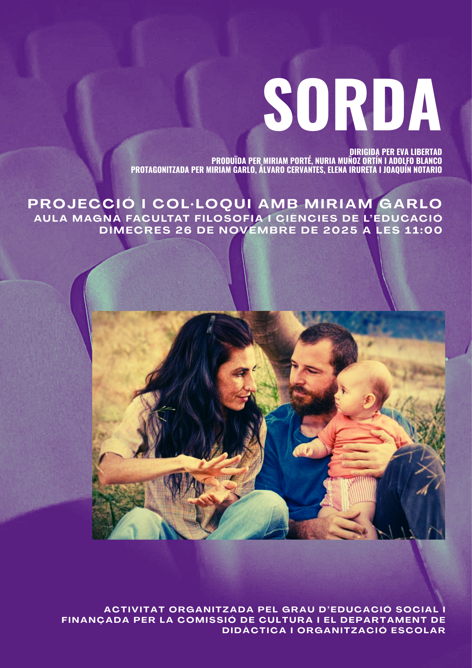 El miércoles 26 de noviembre de 2025 a las 11:00 h, el Aula Magna de la Facultad de Filosofía y Ciencias de la Educación acogerá la proyección de la Película Sorda, dirigida por Eva Libertad y protagonizada por Míriam Garlo, que participará en un coloquio posterior con el público.