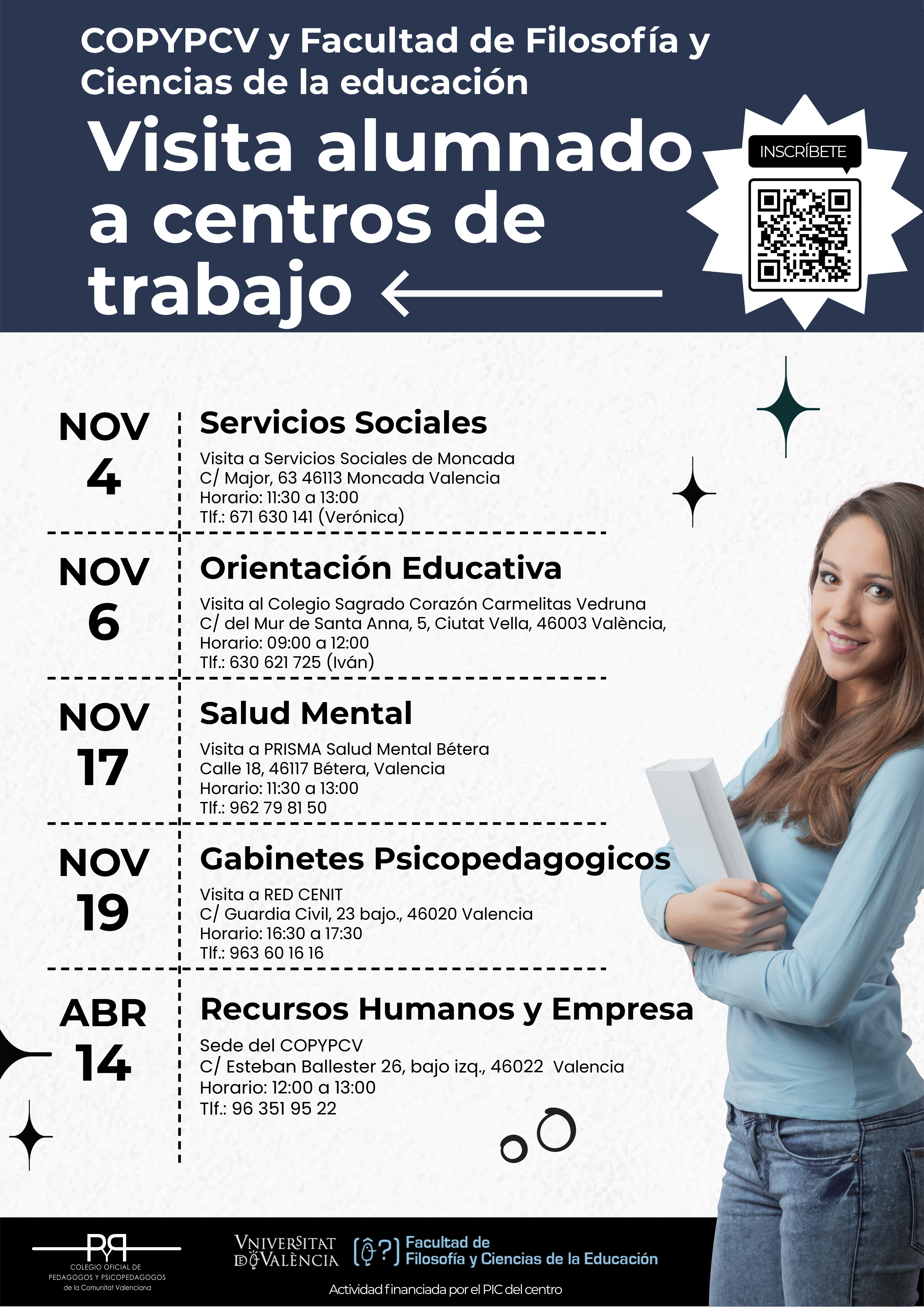 En col·laboració amb el Col·legi Oficial de Pedagogs i Psicopedagogs de la Comunitat Valenciana, hem organitzat una sèrie de visites a centres de treball amb l’objectiu d’oferir-vos una experiència directa i real de l’exercici professional en diferents àmbits (vegeu cartell adjunt).