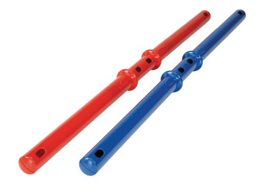Dos varillas de la misma masa, una con pesas cerca de la empuñadura (roja) y otra con pesas en los extremos (azul)