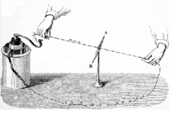 Breve Nota Histórica: A principios del s. XIX estaba en el ambiente la metafísica de Schelling (filósofo de la naturaleza) que propugnaba la unidad de las fuerzas naturales. Esto propició la consideración, a priori, de que existía una relación entre fuerzas magnéticas y eléctricas. Uno de ellos fue Oersted, quien determinó experimentalmente la desviación de la aguja de una brújula en presencia de un hilo conductor recorrido por corriente. La instrumentación necesaria incluía pilas de Volta, algo extremadamente común actualmente, pero bastante sofisticado en aquel momento.