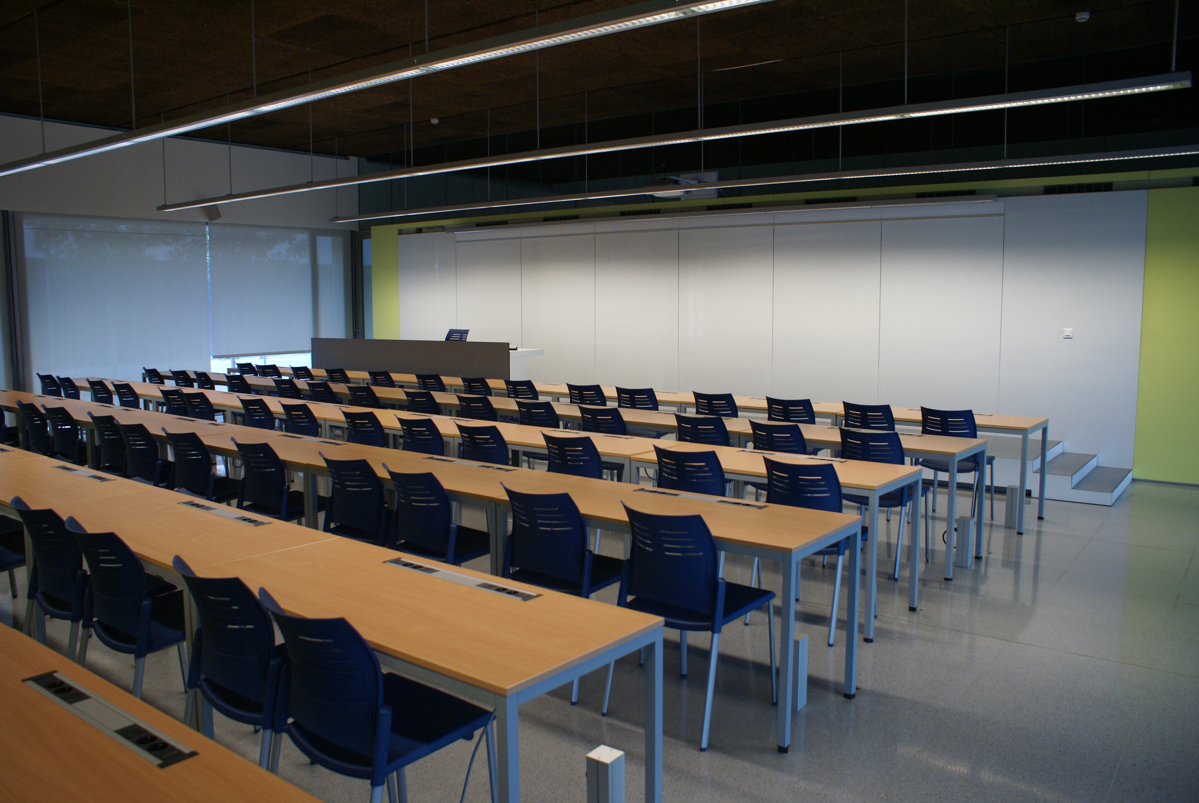 Aula con capacidad para 60 personas. Dispone de cañón de proyección y ordenador al aula además de aire acondicionado. Equipado con pupitres.