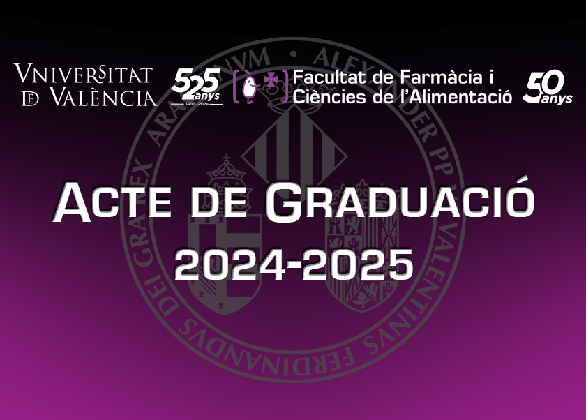Acte de Graduació 2024-2025 Acte de Graduació 2024-2025 17/11/25 La Facultat de Farmàcia i Ciències de l'Alimentació celebrarà el proper Dijous 27 de novembre de 2025, a les 18 hores, l'Acte Acadèmic de Graduació dels titulats i titulades del curs 2024-2025.[Llegir més]