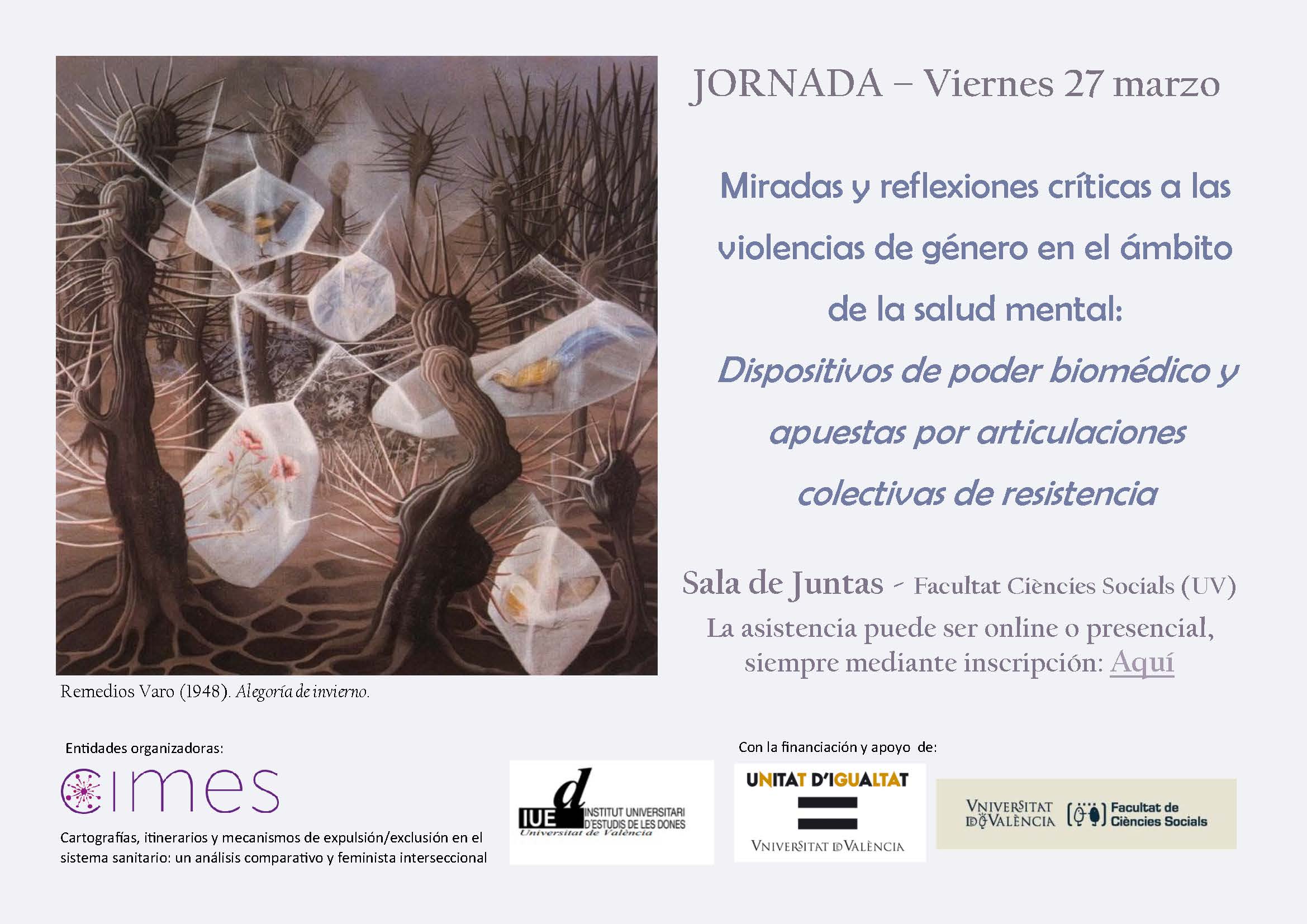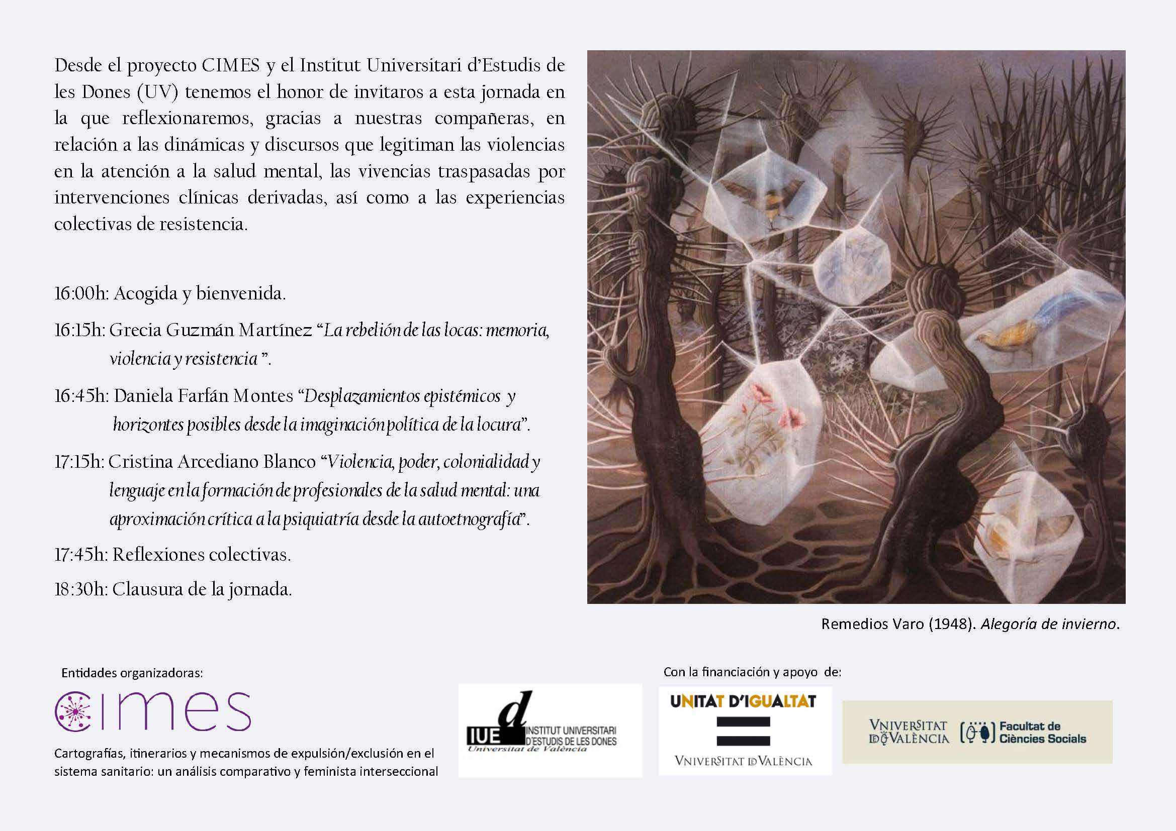 Des del projecte CIMES i l'Institut Universitari d’Estudis de les Dones (UV), i amb el finançament de la Unitat de la Igualtat (UV), tenim l'honor de convidar-vos a esta jornada en la qual reflexionarem, gràcies a les nostres companyes, en relació amb les dinàmiques i discursos que legitimen les violències en l'atenció a la salut mental, les vivències traspassades per intervencions clíniques derivades, així com a les experiències col·lectives de resistència.