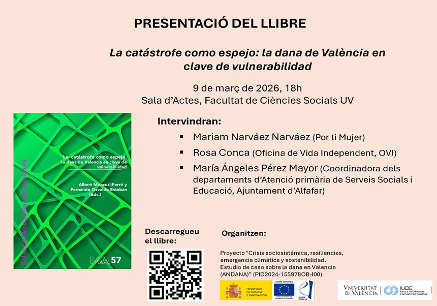 El próximo lunes 9 de marzo se presentará el libro La catástrofe como espejo: la dana de València en clave de vulnerabilidad, cuya edición han realizado Fernando Esteban, investigador del IUCIE, y Albert Moncusí-Ferré, con prólogo de Sandrine Revet.