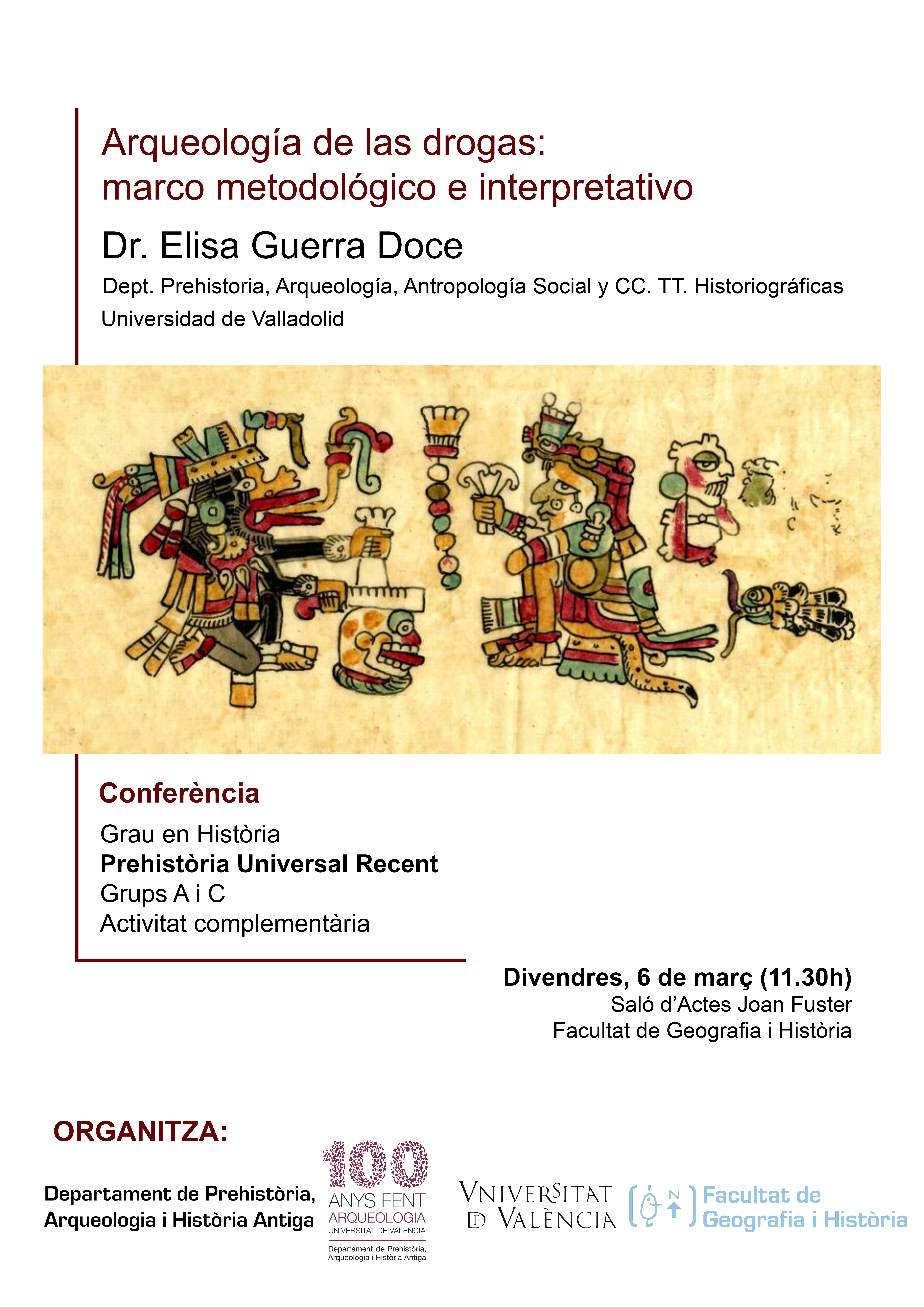 Elisa Guerra Doce, Professora Titular de Prehistòria de la Universidad de Valladolid, presentarà la conferència “Arqueología de las drogas: marco metodológico e interpretativo”.